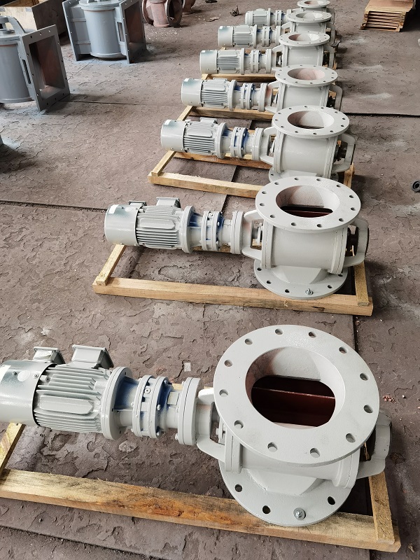 星型卸灰阀依靠物料的重力作用及给料机工作机构的强制作用,将仓内的物料卸出并连续均匀地喂入下一装置中去。星型卸灰阀主要由电机、减速机、壳体、叶轮、主轴、轴承、左右端盖组成。采用钢板焊接结构,叶片性强,集传动装置、传动轴、叶片联为一体。由于星型卸灰阀的轴承和减速机都是向外凸出,能够避免粉尘挤进轴承和大颗粒物料卡死现象。工作时由减速电机通过联轴带动叶轮转动,把壳体上部的物料均匀带到下部,由下一个装置把物料送走。所以,星型卸灰阀只能直立安装,而不允许水平安装,给料机的上部要保持 的料柱。